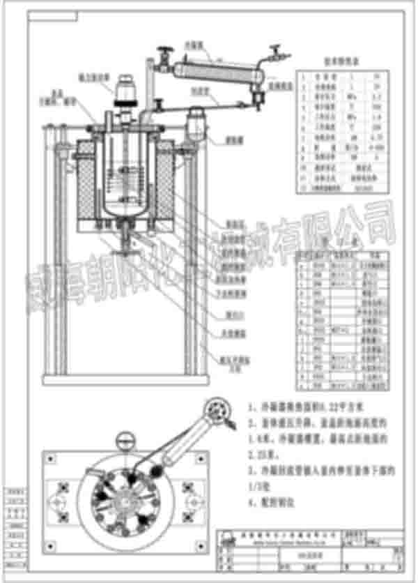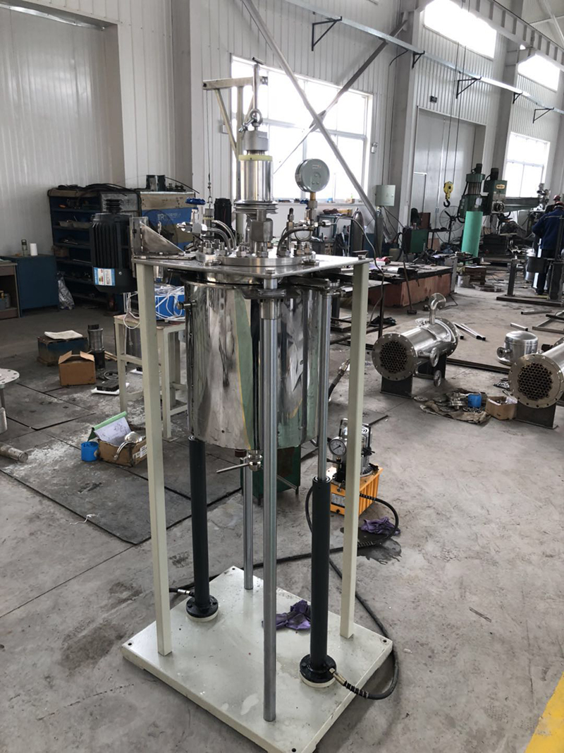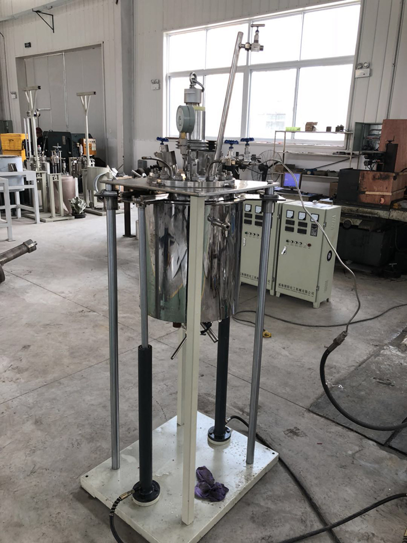 我公司為江蘇地區(qū)客戶制作的20L反應釜。設備采用磁力驅(qū)動攪拌器配推進式攪拌槳葉,攪拌轉(zhuǎn)速為500r/min。反應釜設計溫度達240℃,設計壓力為2.2MPa。制造材質(zhì)為不銹鋼S31603。該設備配備了冷凝回流裝置。釜內(nèi)配備冷卻水盤管。此設備釜蓋為框架固定,釜體配電動液壓裝置升降。